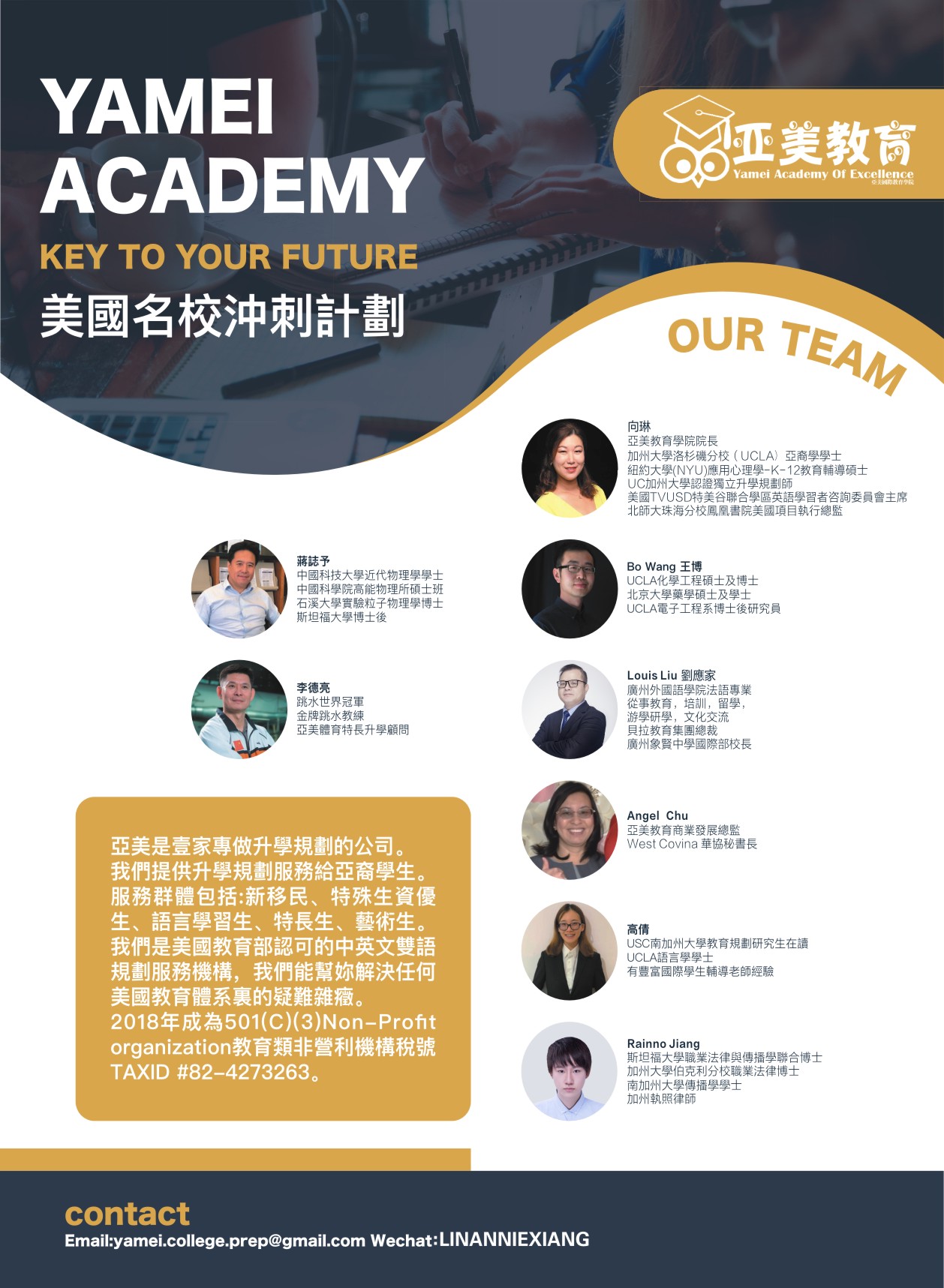 Yamei Academy of Excellence formerly known as Yamei Education & Counseling Center was established in 2011 in Los Angeles, USA. It became a 501 (C) (3) Non-Profit Organization in 2018. Yamei Academy is Better Business Bureau (BBB) certified member, tax ID TAX ID # 82-4273263.